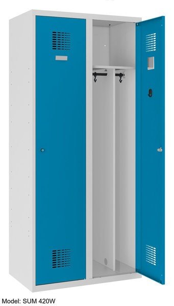 - Szafki dwudrzwiowe typu SUM - Pozwalają na przechowywanie odzieży roboczej i prywatnej w osobnych komorach.